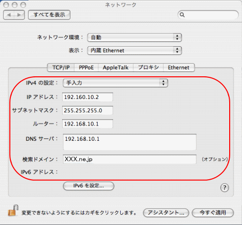 [IPv4の設定]のポップアップメニューから[手入力]を選択し、 下記のように設定する
