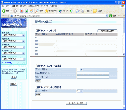 | [最新状態に更新]をクリックすると、最新の「静的NATエントリ」を表示します。 |