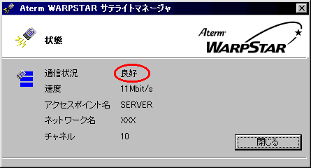 無線の通信状況が「良好」になることを確認してください。「良好」にならない場合には、「良好」と表示される位置までパソコンを移動させてください。