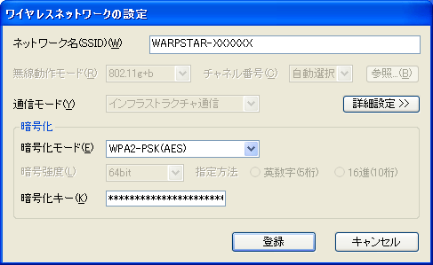 WPA-PSK(TKIP)/WPA-PSK(AES)/WPA2-PSK(TKIP)/WPA2-PSK(AES)使用時は8〜63桁の英数記号または64桁の16進数を入力します。