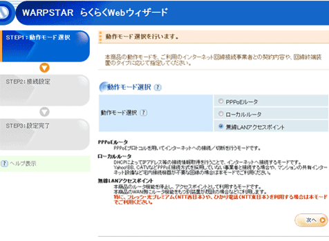 「らくらくWebウィザード」は、工場出荷時の状態で初めて「クイック設定Web」を開く操作を行ったときに1度だけ起動される選択式の設定方法です。