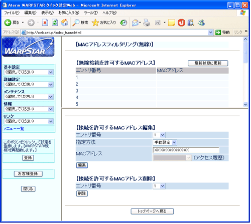 (画面は、エントリ番号1にMACアドレスの入力例を入れています) |
