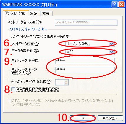 画面に[ネットワークアソシエーション]・[データの暗号化]が表示される場合は、[開いています]・[WEP]を選択します。 |