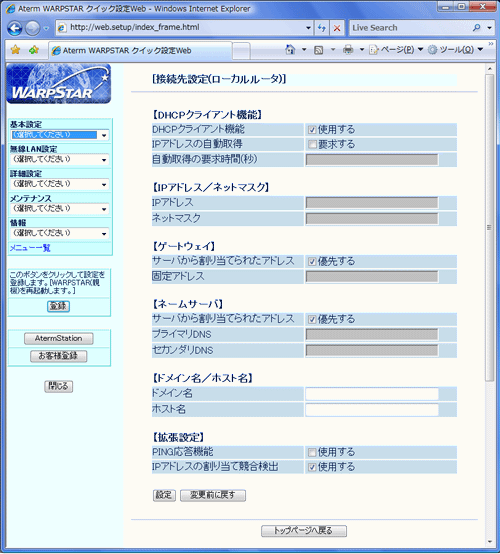 「らくらくWebウィザード」で「ルータ機能」を「使用しない」に選択した場合です。 |