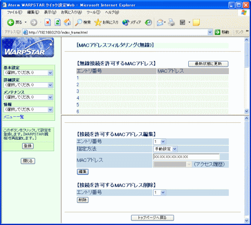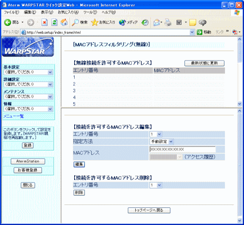 (画面は、エントリ番号1にMACアドレスの入力例を入れています) |
