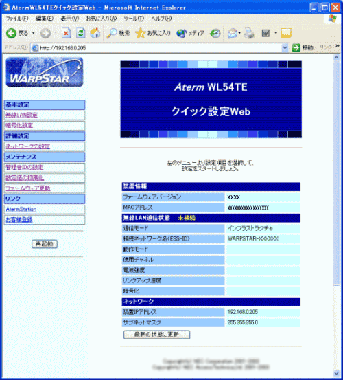 WWWブラウザを起動し、無線LANアクセスポイント(親機)のIPアドレスを入力し、設定画面のページを開く