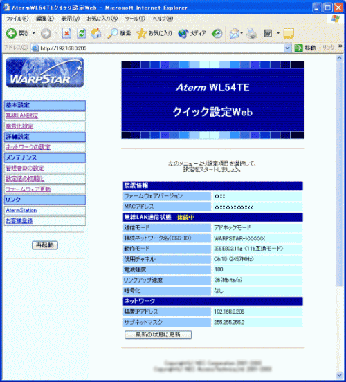 再起動後、下記の画面が表示され、無線設定が正しく行われていることを確認できます。 |