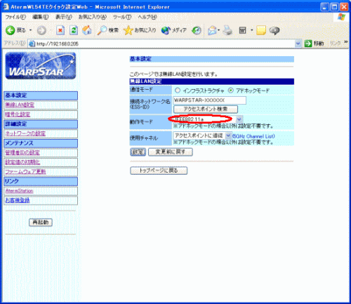 [無線動作モード]を変更する場合は、使用する無線規格を選択する |