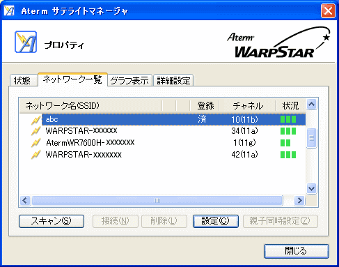 [ネットワーク一覧]タブをクリックし、設定するネットワーク名(SSID)を選択して、[設定]をクリックする