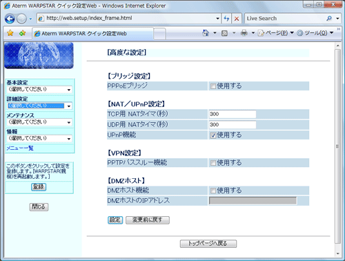 - PPPoEブリッジ機能をご利用になると、インターネットからの不正なアクセスがLAN側に接続した機器(パソコンやゲーム機など)に直接届きます。最新のセキュリティを設定してご利用ください。