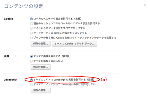 - 「Javascript」で「すべてのサイトでJavascript の実行を許可する(推奨)」を選択する(<図1>の(a))