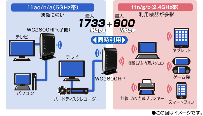- ◎ WG2600HP(子機)は有線ギガを4ポート搭載。デジタル家電などをまとめて無線化できます。