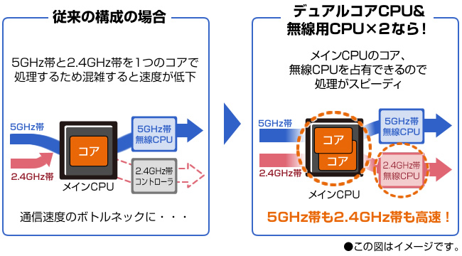 2つのコアを持つデュアルコアCPUを搭載。さらに、2つの無線用CPUを搭載することで、5GHz帯と2.4GHz帯両方の電波を同時に利用した場合でも高速な通信を実現します。