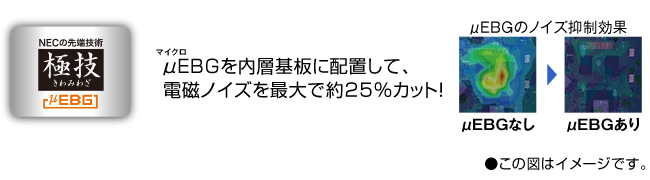 アンテナへのノイズ侵入を遮断するのが「μ(マイクロ)EBG」技術です。本体のプリント基板内を伝わり基板の端などから放射される電磁ノイズを遮断し、アンテナへのノイズの侵入を最大で約25%カット。受信感度の向上により安定した高速通信を実現します。