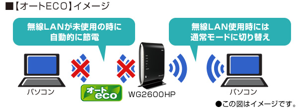 無線LAN機器を使っていないときには【ECOモード】に。使用時には、すぐに通常モードへ自動的に切り替わる便利なECO機能です。消費電力を最大14%削減します。
