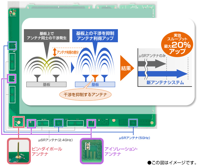 電波を360゜全方位へしっかり飛ばす超小型の[μ(マイクロ)SRアンテナ]に加えて、[ピン・ダイポールアンテナ]と[アイソレーション・アンテナ]を搭載した[新アンテナシステム]を採用。アンテナ間の干渉が抑制されアンテナ性能が向上することにより、スループットが最大で約20%アップします。
