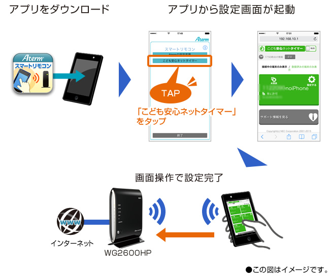 お手持ちのスマートフォン/タブレットとWG2600HPをWi-Fi接続後、「Aterm スマートリモコン」を起動すると自動でWG2600HPを検索。あとは画面表示に従ってタップするだけで【こども安心ネットタイマー】の設定画面を開くことができます。