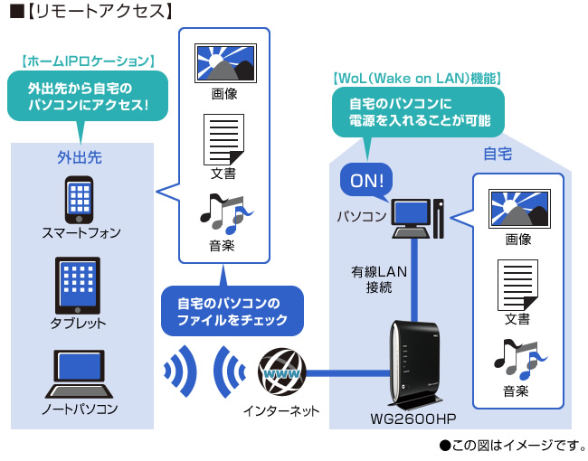 インターネットからホームIPロケーション名でWG2600HPへのアクセスを可能にするホームIPロケーション機能。固定IPアドレスやダイナミックDNSサービスなどの契約や難しい設定、面倒な登録をしなくても、アクセスが可能※。