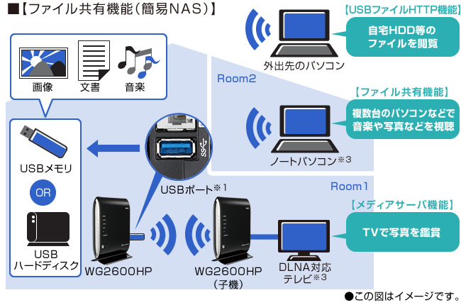 USBポートに外付けのハードディスクやUSBメモリなどを接続※1すれば、【ファイル共有機能】により簡易NASとして使用可能。読み取り/書き込みが可能なファイルサーバとして、映像や音楽、写真などのデータファイルを共有し、複数台のパソコンやテレビなど※3で楽しめます。