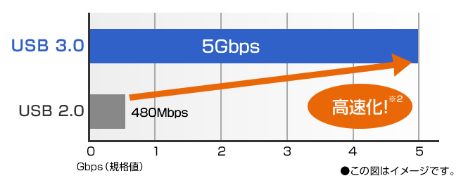 USBポートが高速の「3.0」に対応しました。外付けのハードディスクやUSBメモリなどを接続※1すると、USB 2.0よりも高速※2にデータファイルのダウンロードや共有が行えます。