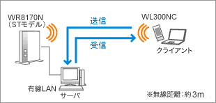 AtermWR8170N(STモデル)[ローカルルータモード]のLANポートに接続したサーバパソコンからAtermWL300NCを実装したクライアントパソコンへのデータ転送速度(受信)の実測値です。なお、クライアントパソコンからサーバパソコンへの通信速度(送信)は、受信速度より低い場合があります。