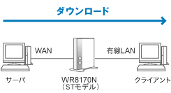 AtermWR8170N(STモデル)のWANポートに接続したサーバからLANポートに接続したクライアントパソコンでファイルをダウンロードした場合のデータ転送速度の実測値です。