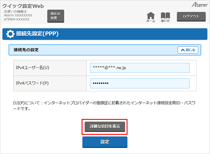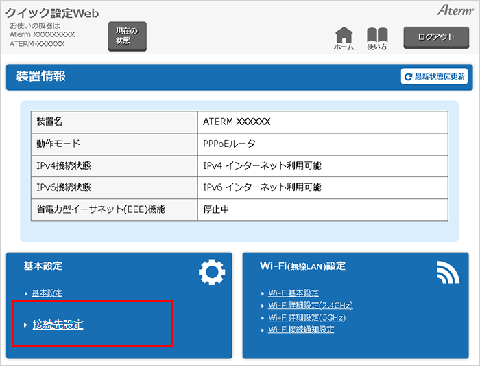 クイック設定Webのホーム画面で、『基本設定』-『接続先設定』を選択してください。