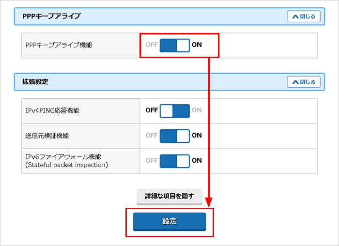 「PPPキープアライブ機能」をONにして、【設定】ボタンを押してください。