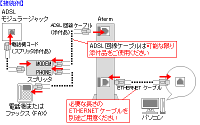 ADSLモジュラージャックからAtermの設置場所まで距離がある場合は、必要な長さのETHERNETケーブル(Atermとパソコン間をつなぐケーブル)を別途ご購入の上、ご使用ください。