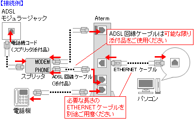 ADSLモジュラージャックからAtermの設置場所まで距離がある場合は、必要な長さのETHERNETケーブル(Atermとパソコン間をつなぐケーブル)を別途ご購入の上、ご使用いただくか、無線LANをご利用ください(無線LANの利用可否はご契約内容により異なります)。