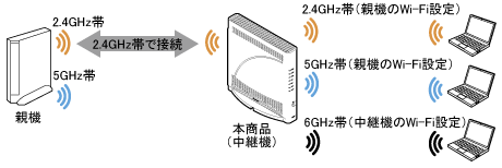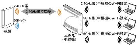 中継機(本商品)と子機間は、2.4GHz帯/5GHz帯/6GHz帯のうちいずれか2つを同時に使用することができます。子機は、同時使用している2つの周波数帯のうちいずれかのネットワークを選択して接続することができます。親機と中継機(本商品)間は、2.4GHz帯、5GHz帯または6GHz帯で通信します。