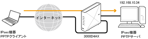 IPsecまたはPPTPによるVPN接続を使用することにより、インターネットを経由してLAN側のIPsec機器/PPTPクライアントからWAN側のIPsec機器/PPTPサーバにアクセスすることができます。また、本商品の動作モードがPPPoEルータモードまたはローカルルータモードの場合は、WAN側のIPsec機器/PPTPクライアントからLAN側のIPsec機器/PPTPサーバにアクセスするように設定することも可能です。