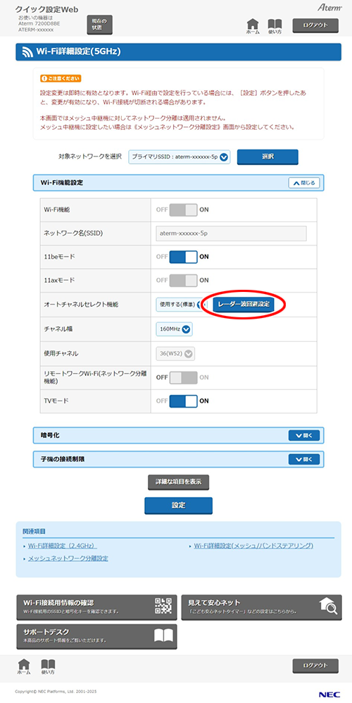 ホーム画面の「Wi-Fi(無線LAN)設定」-「Wi-Fi詳細設定(2.4GHz)」または「Wi-Fi詳細設定(5GHz)」をクリックします。