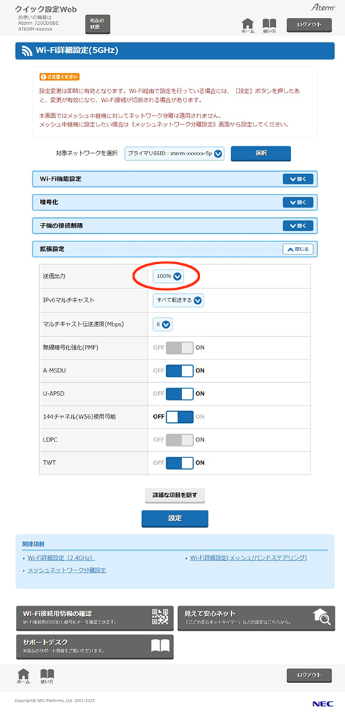 ※ 以下は「Wi-Fi詳細設定(5GHz)」の場合の例です。