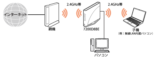 親機と中継機(本商品)間、中継機(本商品)と子機間ともに2.4GHz帯で通信します。