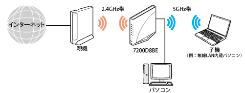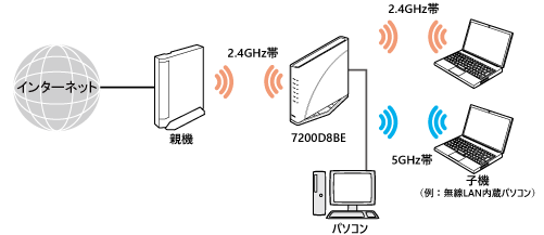 中継機(本商品)と子機間は、5GHz帯通信と2.4GHz帯通信の両方を同時に使用することができます。子機は、5GHz帯のネットワークか2.4GHz帯のネットワークを選択して接続することができます。 親機と中継機(本商品)間は、5GHz帯または2.4GHz帯で通信します。