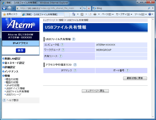 本商品のUSBファイル共有情報やファイル共有機能に接続中の端末を表示します。