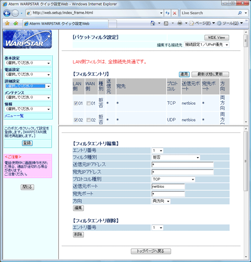また、工場出荷時にエントリ14〜18番が適用されていますが、 これらはNetBIOS等によるWAN側への意図しない情報漏洩を防止するためのものです。