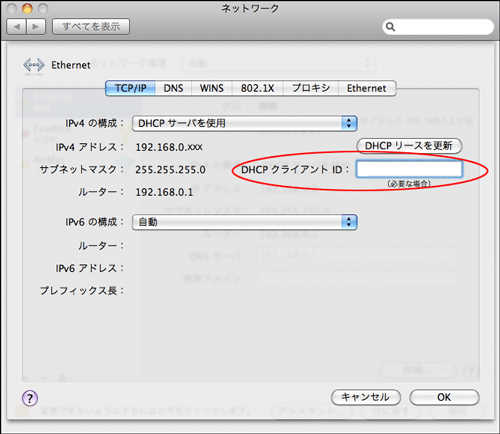 | 4. | [IPv4の構成]のポップアップメニューから[DHCPサーバを使用]を選択し、[DHCPクライアントID]空白にし、[OK]をクリックする |