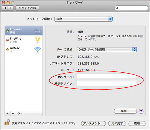 | 5. | 表示された画面で [DNSサーバ]、[検索ドメイン]を空白にする |