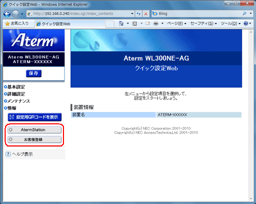 AtermStation(http://121ware.com/aterm/)、お客様登録のページにリンクしています。