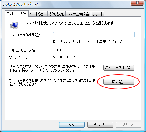 「システムのプロパティ」の「コンピュータ名」タブで[変更]をクリックする |