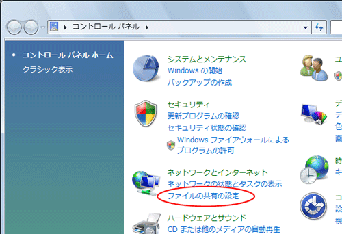 [スタート](Windows(R)のロゴボタン)-「コントロールパネル」-「ネットワークとインターネット」-「ファイルの共有の設定」をクリックする |