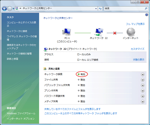 「共有と探索」の「ネットワーク探索」が「有効」になっていることを確認する。 |