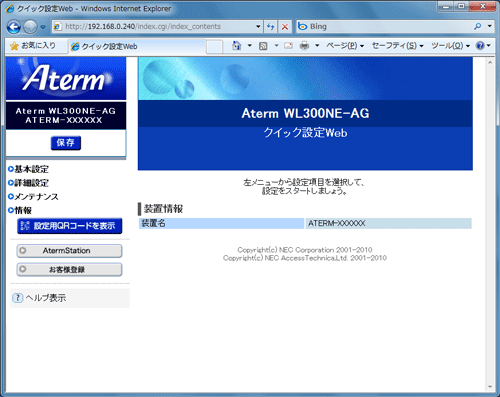 WWWブラウザを起動し、WL300NE-AGのIPアドレスを入力し、設定画面を開く