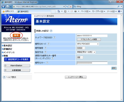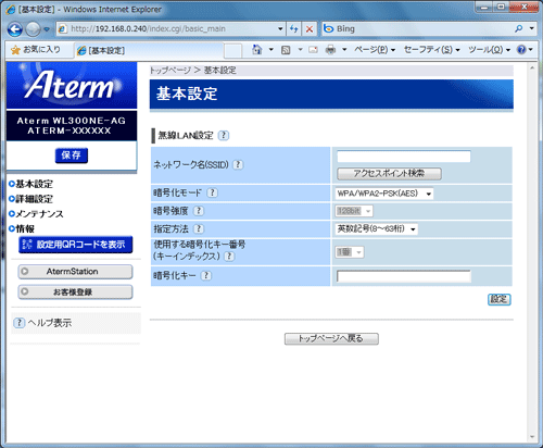 無線LAN親機の暗号化設定に合わせて暗号化の設定を行う |