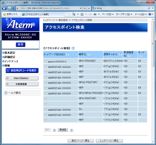 [アクセスポイント検索]をクリックして、表示された「アクセスポイント検索」画面からネットワーク名(SSID)を選択することもできます。
