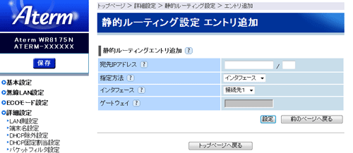 | ※画面の[追加]をクリックすると[静的ルーティング設定 エントリ追加]画面に進みます。 |