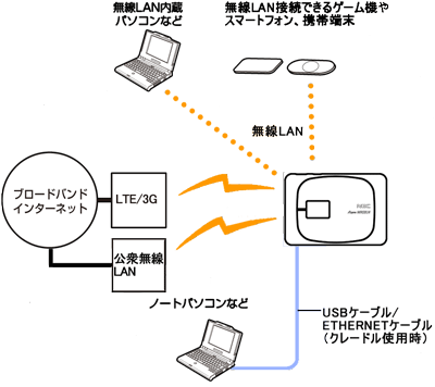 USBポート/ETHERNETポート(100BASE-TXポート)、無線LANインタフェースのそれぞれにパソコンやゲーム機などを接続して構築したローカルネットワークからブロードバンド(LTE/3G、公衆無線LAN)インターネットに接続します。