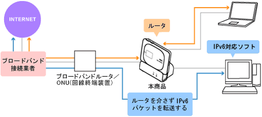 - イーサネットコンバータタイプの無線LAN子機から無線接続してIPv6ブリッジ機能をご利用になる場合は、拡張クライアントモードに対応したWL300NE-AG/WL54SE2/WL54SEをご利用ください。